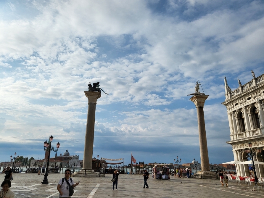 광장 입구 큰 2개의 기둥. 왼쪽 기둥은 베니스의 사자 상징이고 오른쪽 기둥은 도시의 수호자인 산 토다로(San Todaro) 순교자.