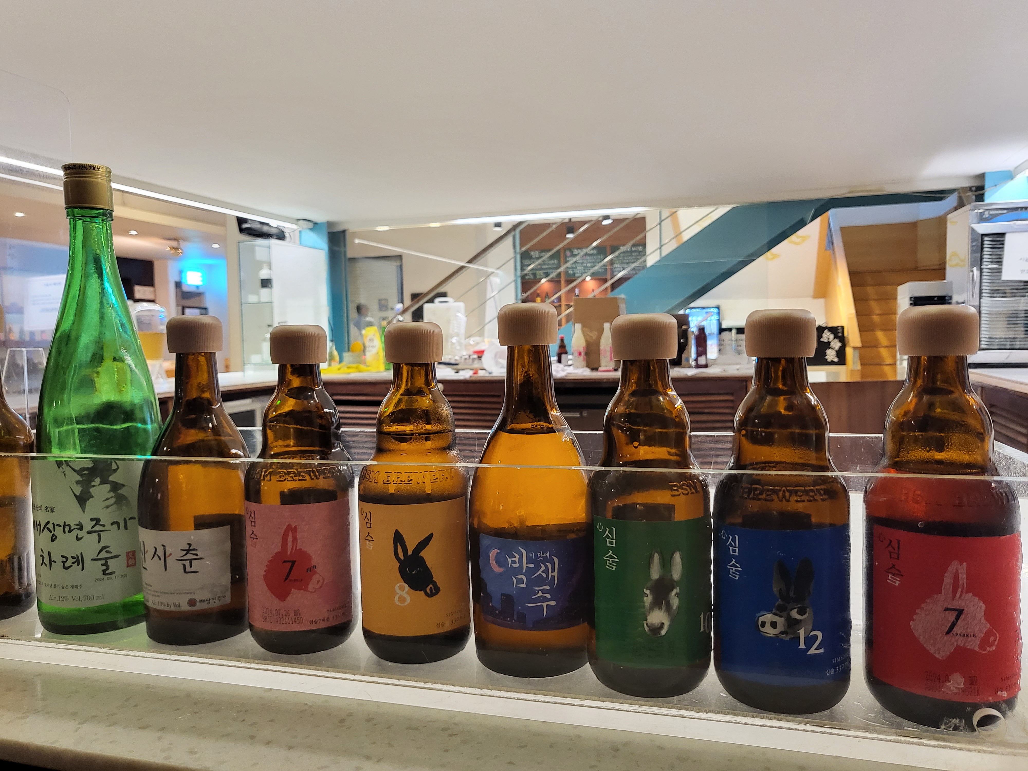 무료 시음 코너. 너무 많이 마시면 취해요 ㅋㅋ. 아래 술 중간에 물병은 시음 후 컵을 헹구는 용도.