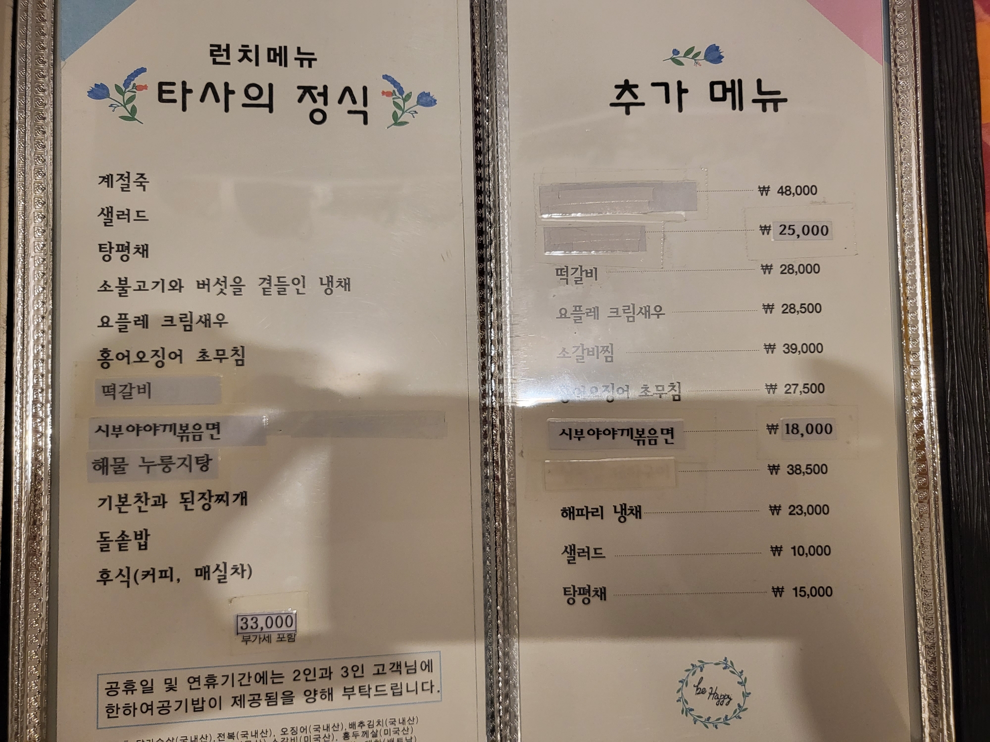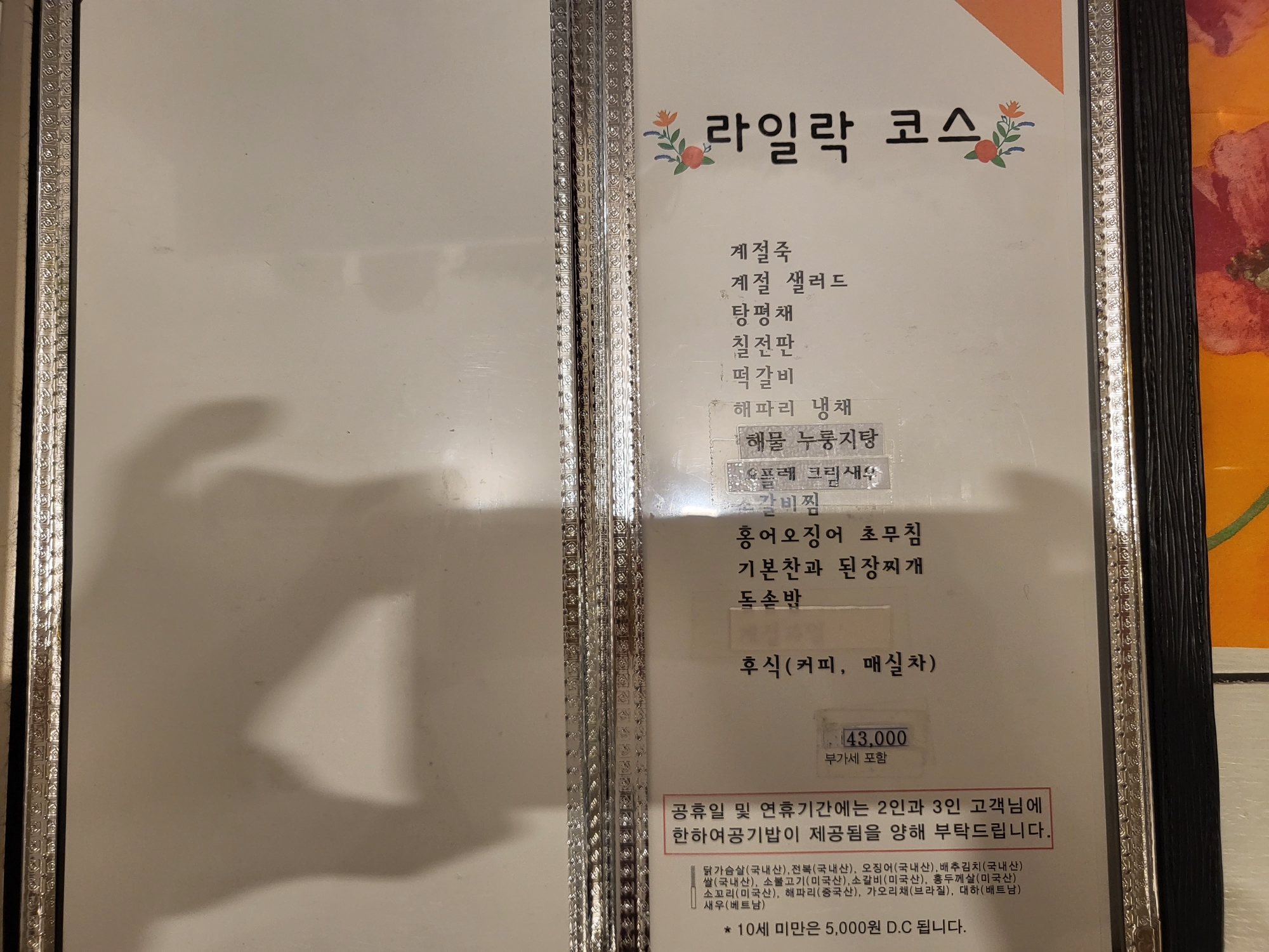 메뉴는 라일락코스 (43,000원) , 점심코스만 있음
