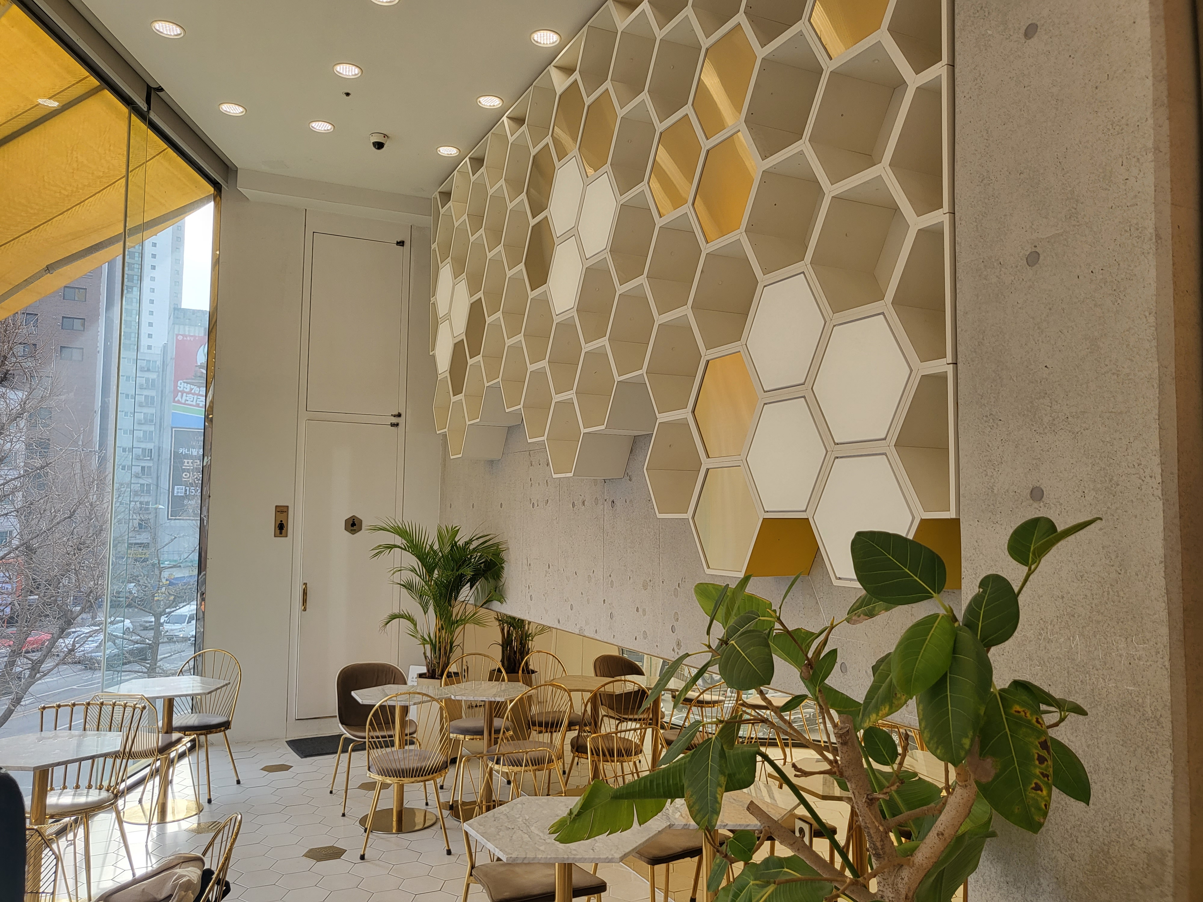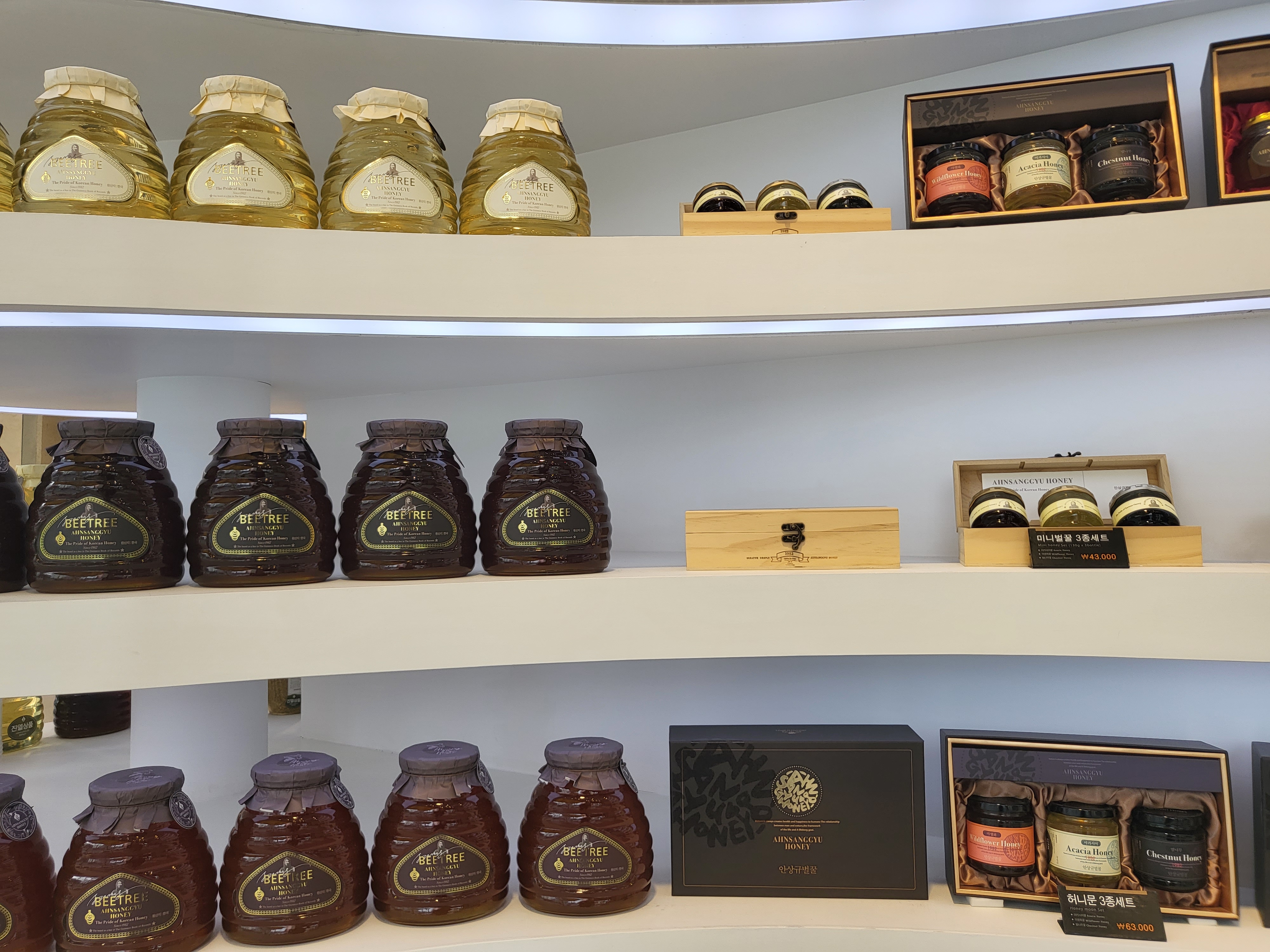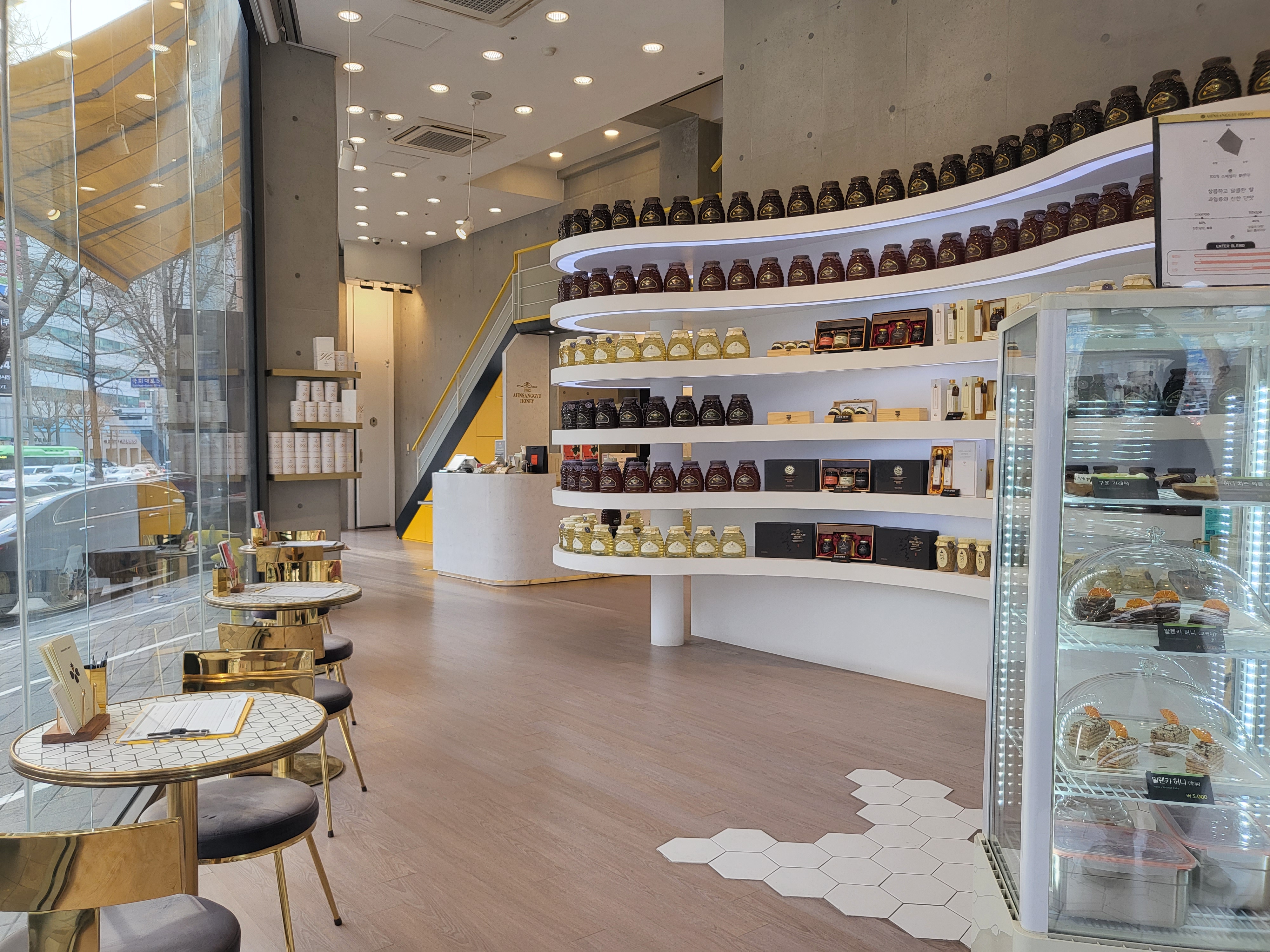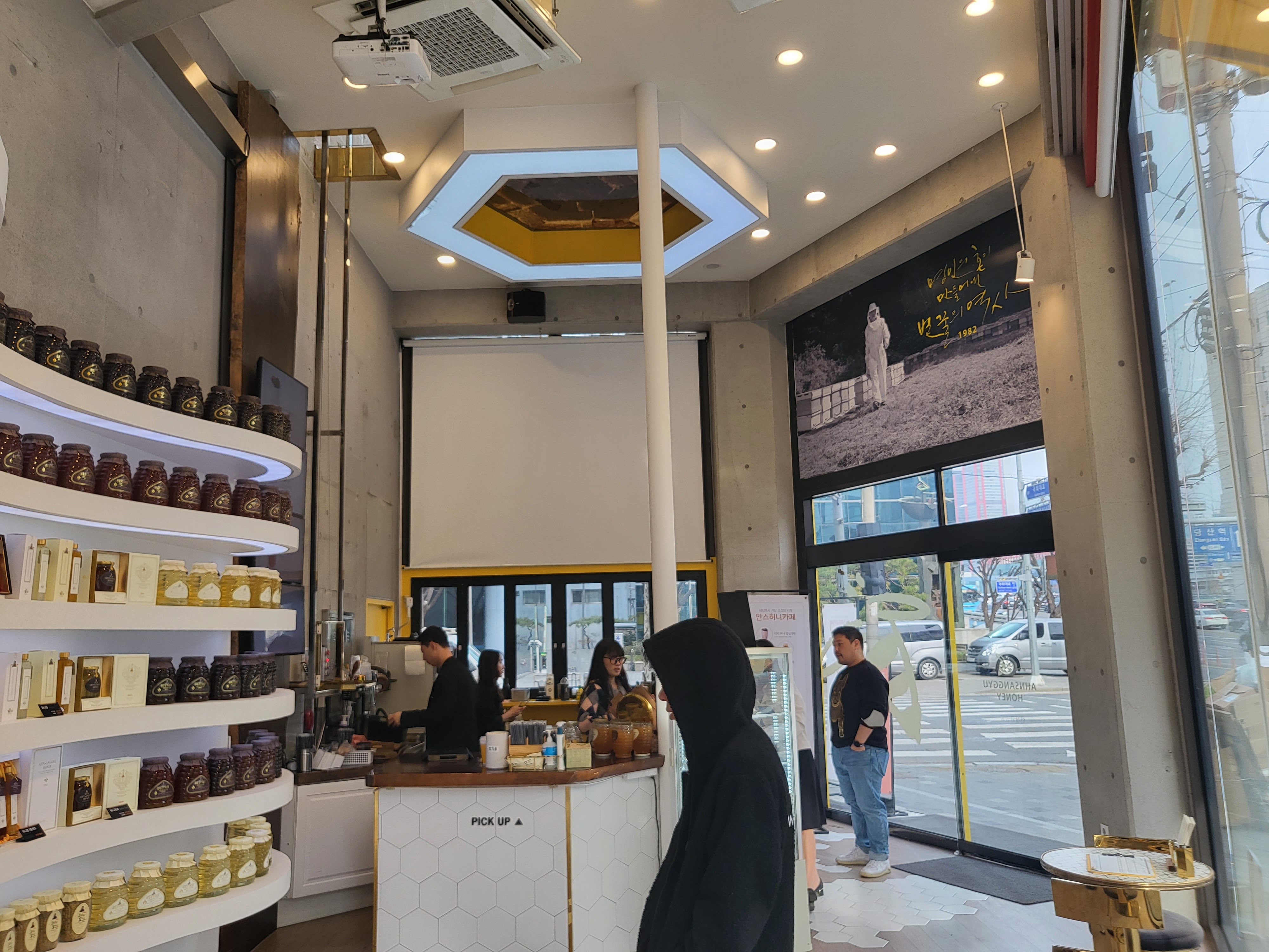 1층카페. 벌꿀 전시되어 있어 구매도 가능
