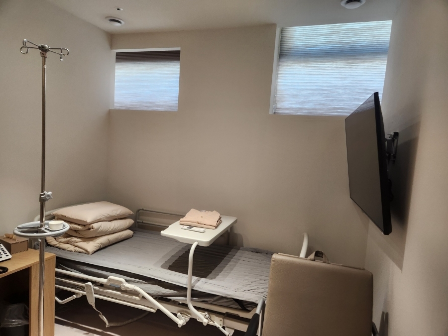7층 입원실. 일반실이지만 1인실로 사용하고 일반 병원의 특실처럼 좋고 저렴하지만 보호자가 함께 있을 수 없음.