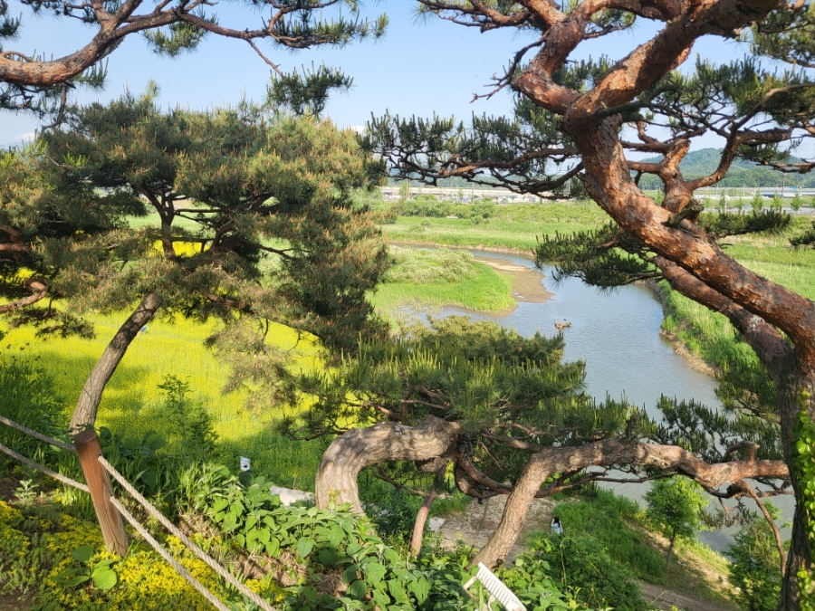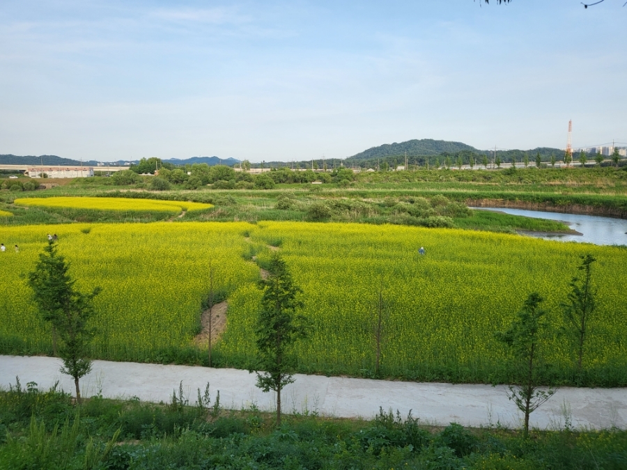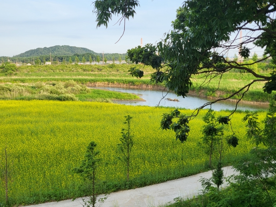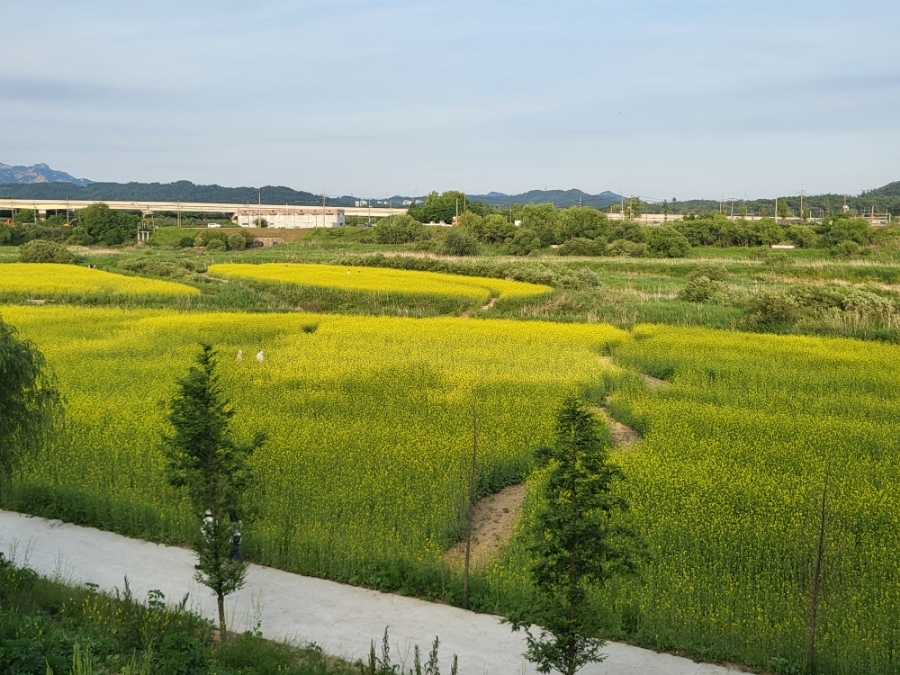 정원에서 보이는 창릉천과 유채꽃밭 모습.