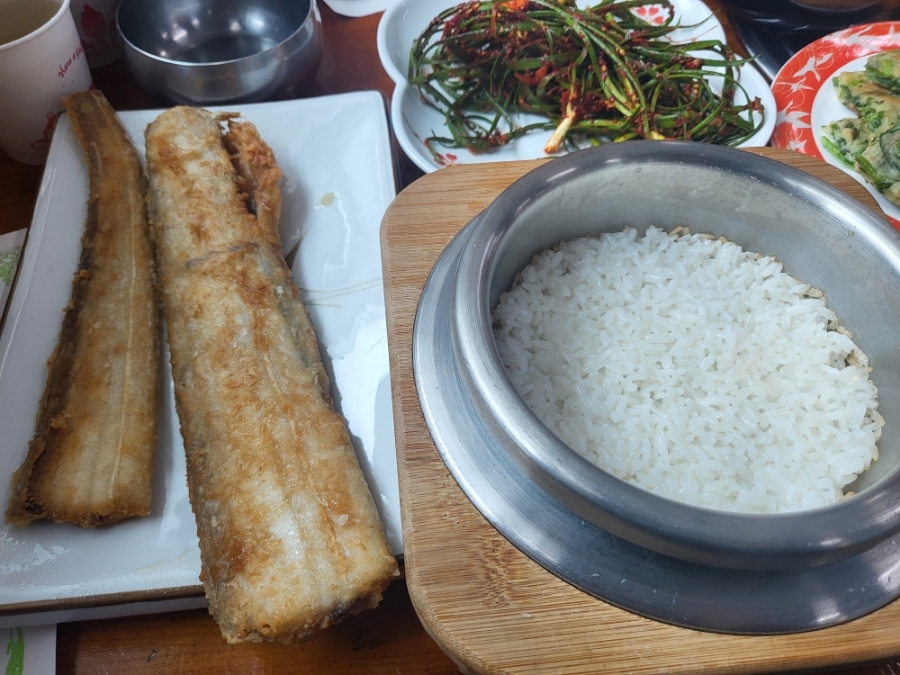 돌솥밥과 갈치구이. 1인당 갈치 1마리(아래 사진이 1인분) 주는데 두껍고 살이 많고 고소함. 강추...