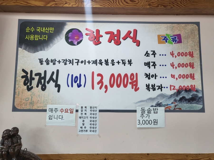 한정식차림 1인당 13,000원인데 돌솥밥, 갈치구이, 제육볶음에 직접 만든 두부까지 줌.
