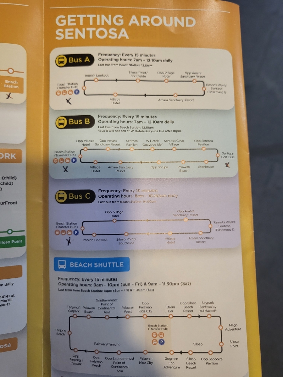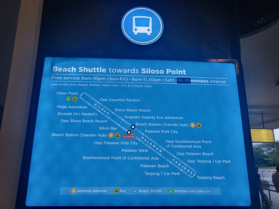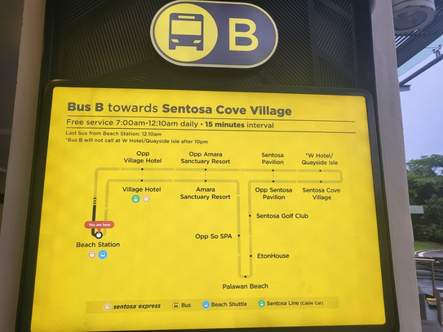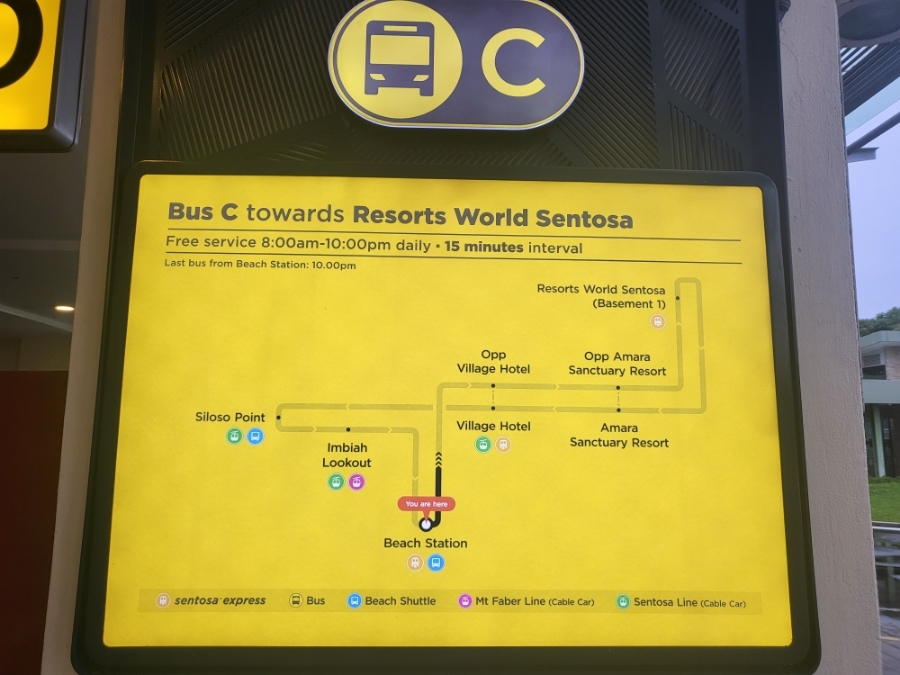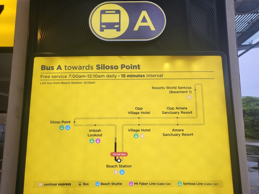 위 안내도 보면 비치스테이션(Beach station-transfer Hub)이라는 정류장이 있는데 여기서 버스 A,B, C 를 환승하고 비치워크(Siloso Beach Walk) 가는 비치셔틀도 탈 수 있으니 우선 비치스테이션으로 가는 걸 추천