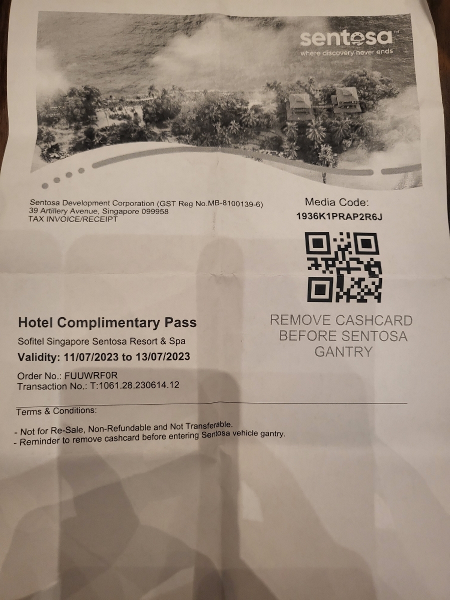 하지만 센토사섬에 있는 호텔을 예약하면 미리 아래와 같은 패스를 보내주니 꼭 출력해서 가져가세요. 입구에서 보여주면 무료 통과. 센토사섬에 있으면 항시 소지해야 외부에서 센토사로 들어올 때 돈 안내요.
