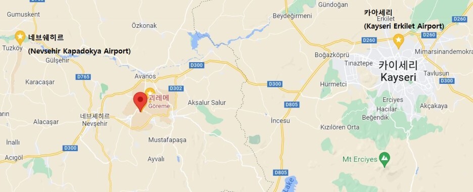 구글 지도로 다시 찾아보니 '괴레메(Goreme)'에는 공항이 없고, 주변에 '네브쉐히르(Nevsehir)'와 '카이세르(Kayseri)'에 공항이 있어 둘 중 하나를 이용해야 합니다.