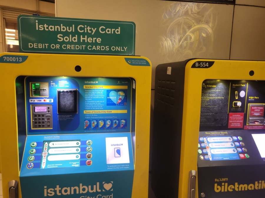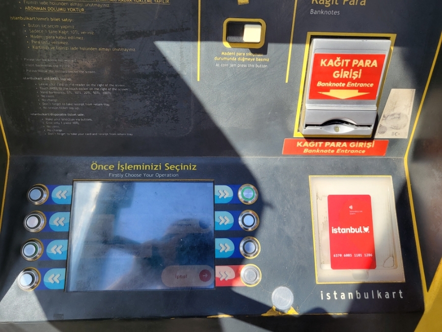 보통은 지하철역이나 페리 선창장에 가면 카드 판매 키오스크가 있고 , 예를 들어 100리라를 넣으면 50리라는 카드 비용이고 나머지 50리라가 충전되는 방식.