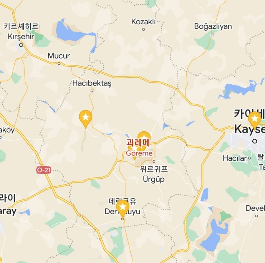 카파도키아는 아래 사진처럼 꽤 넓은 지역을 의미하는데 이 중 괴레메를 가장 중심으로 볼 수 있고 열기구 타기에도 적합한 지역이니 호텔 예약은 괴레메로 하는 것을 추천!!