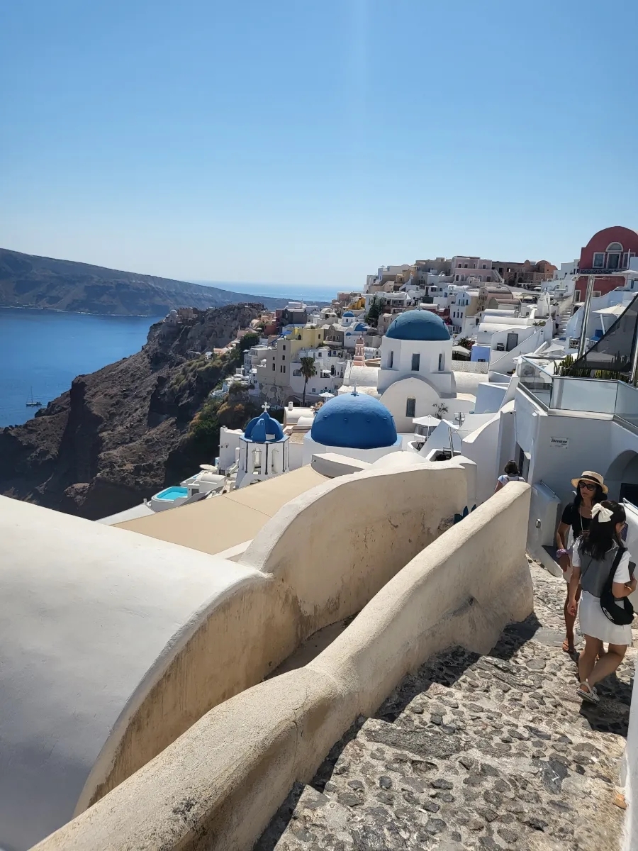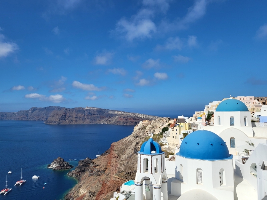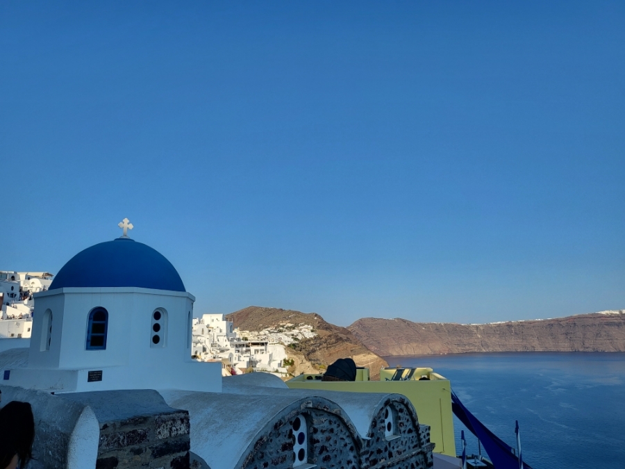 산토리니 사진 명소인 블루돔 산토리니. 우리가 묵던 숙소는 아래 사진 오른쪽 블루돔 바로 위 쪽이라 줄서지 않고 블루돔 사진 마음껏 찍을 수 있었음.