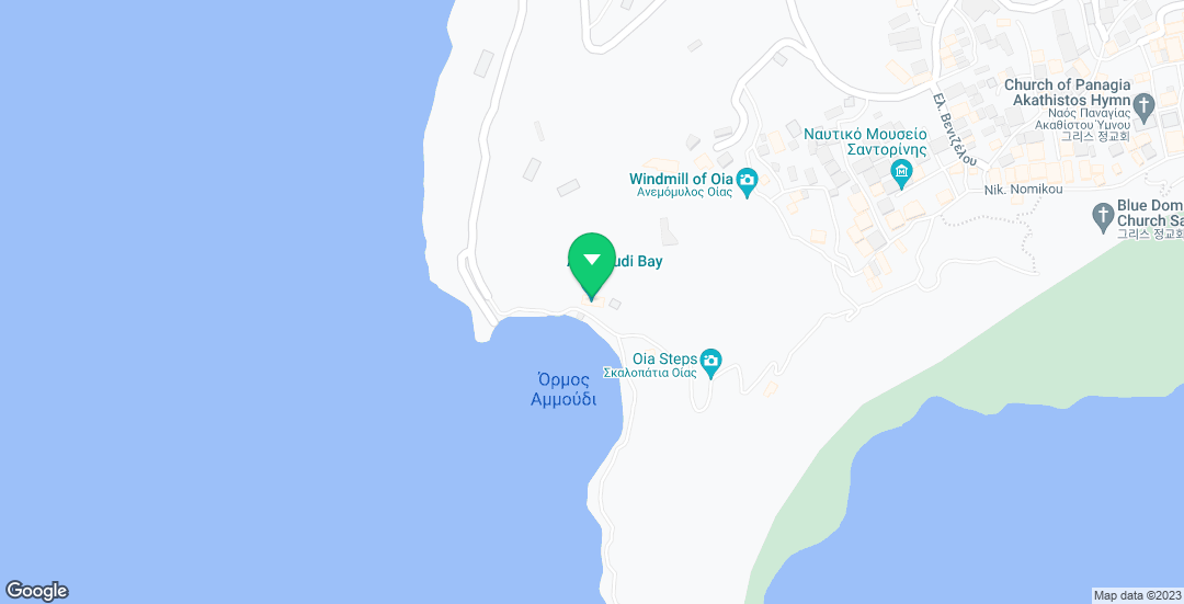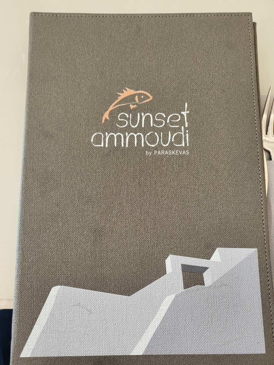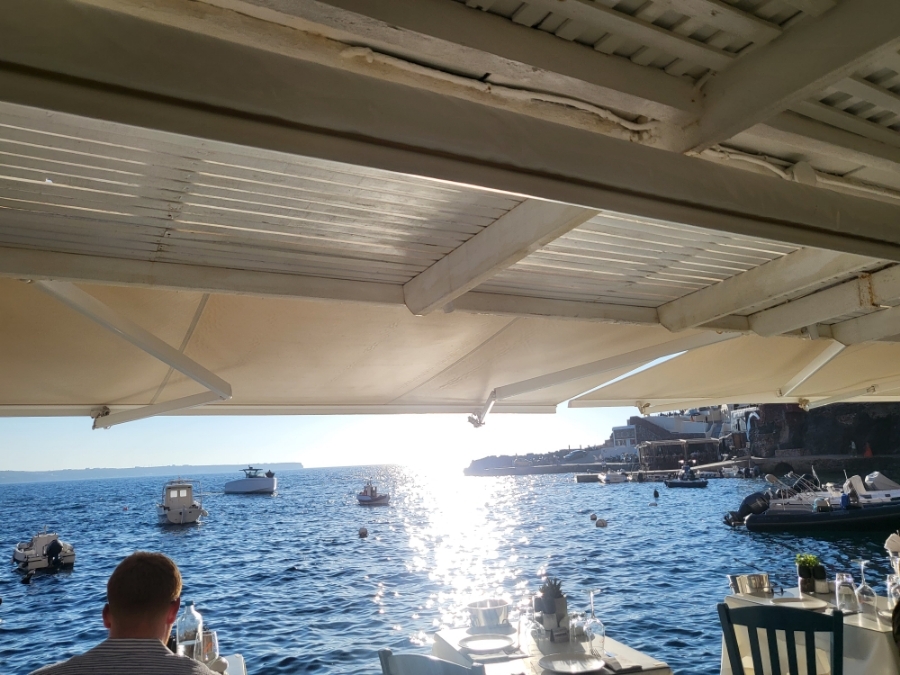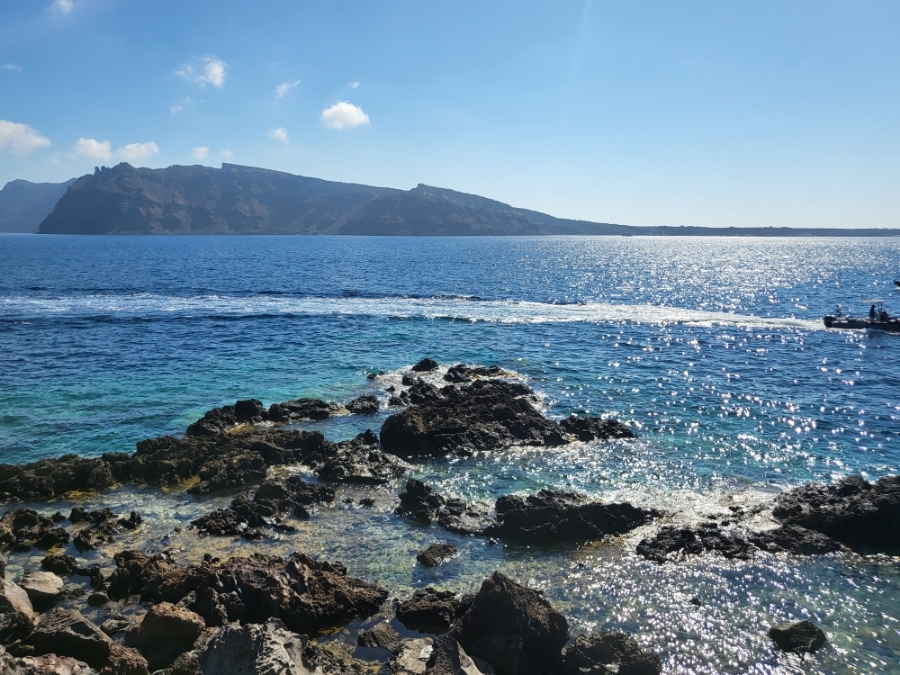 지중해 바다는 정말 맑음. 앞에 식당이 선셋보며 식사할 수 있는 "Sunset Ammoudi by Paraskevas"와 "Dimitris Ammoudi Taverna".