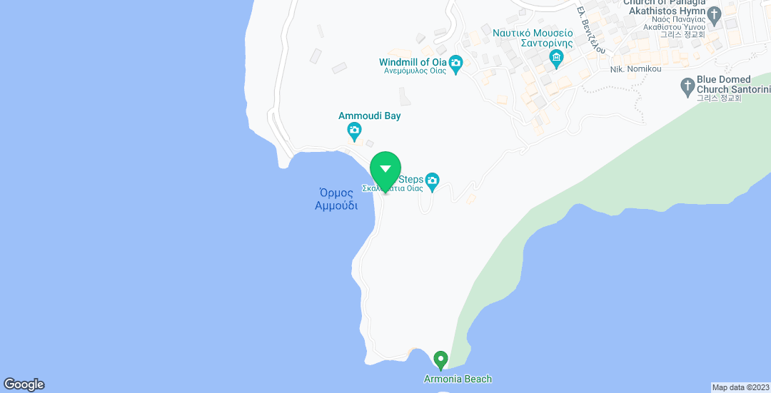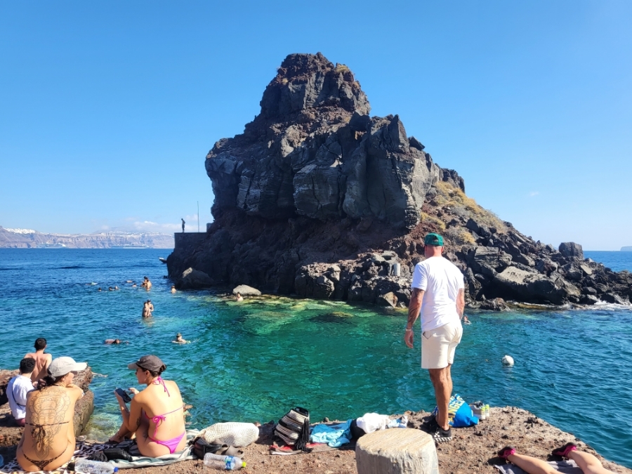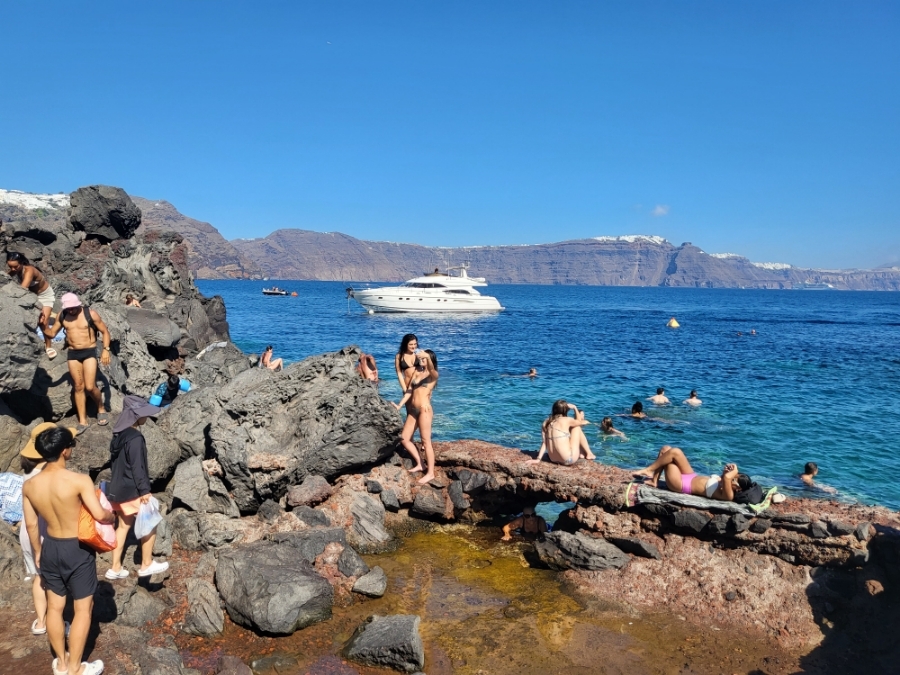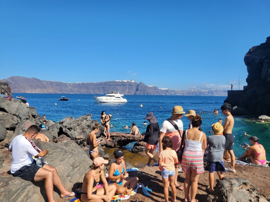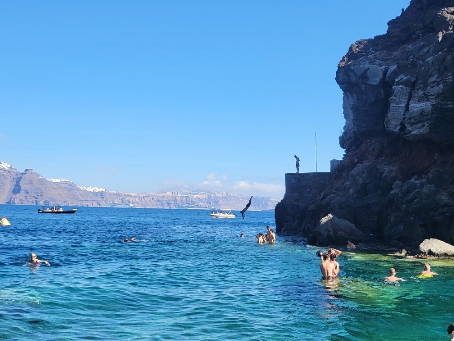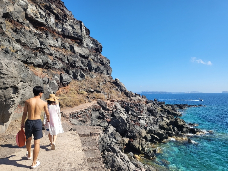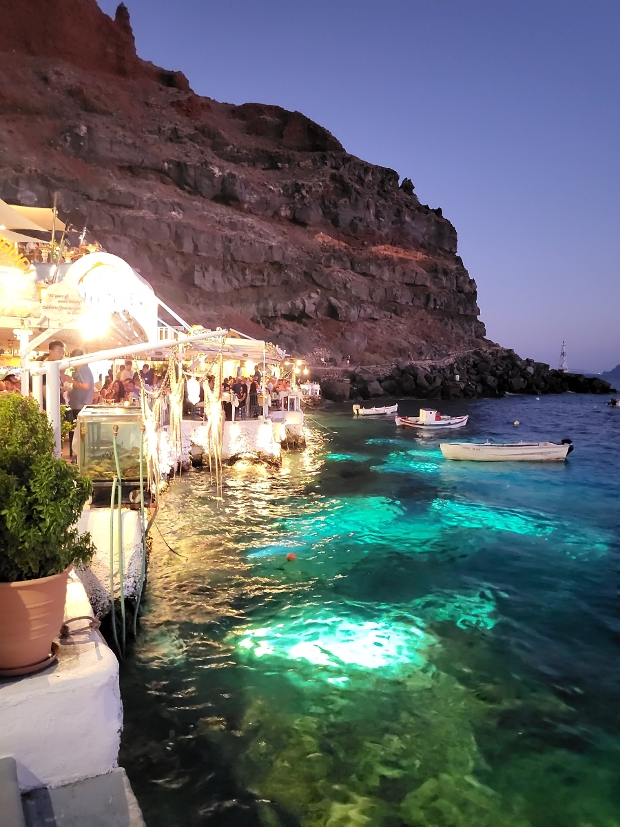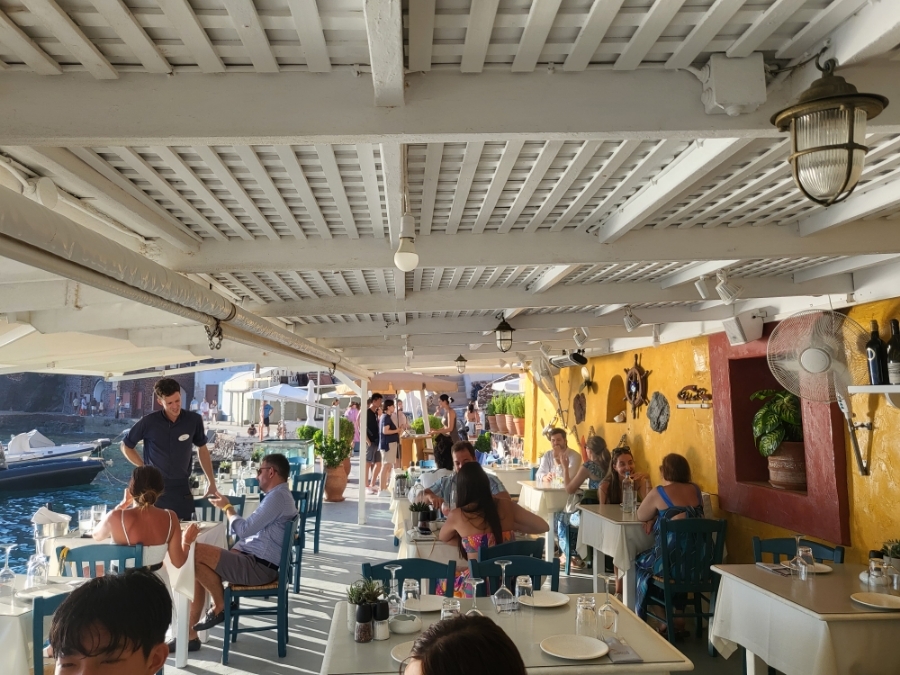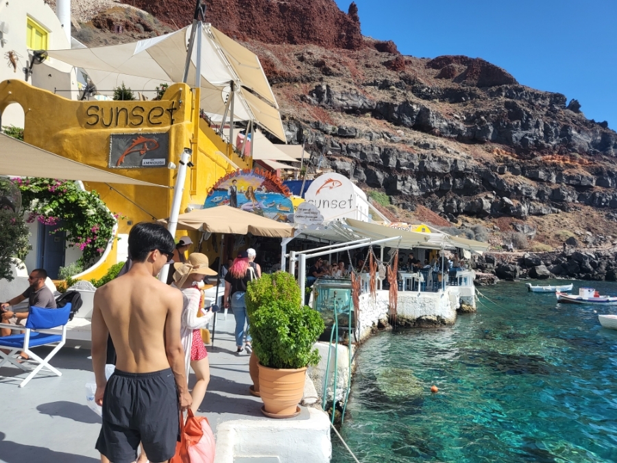 산토리니 이아마을 절벽 아래쪽 아무디베이(Ammoudi)는 에머랄드 빛 바다에서 수영하고 식당에서 선셋(예약 필요)을 볼 수 있는 곳임.