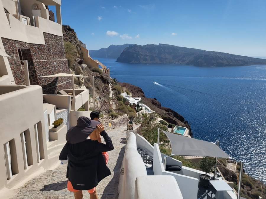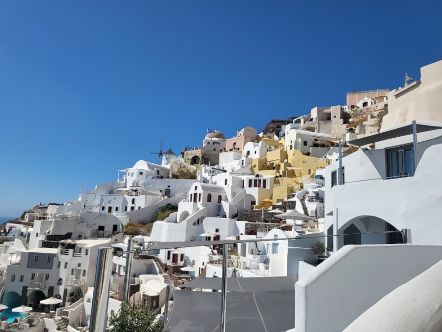 계단 옆에 호텔들. 이 호텔에서는 선셋을 쉽게 볼 수 있으나 이아마을에서 약간 외진 위치로 볼 수 있음.