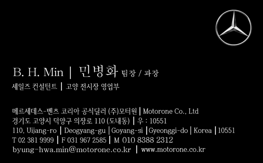 구입 시점과 상황, 차량에 따라 할인 금액이 다르겠지만 민병화 팀장님에게 진행하시면 만족할 만한 거래가 될 수 있을 것 같으니, 벤츠 차량에 관심 있는 분은 아래 명함 연락처 보시고 연락하시고, 블로그 보고 연락했다고 하시면 더 잘 해 주실 겁니다. !!