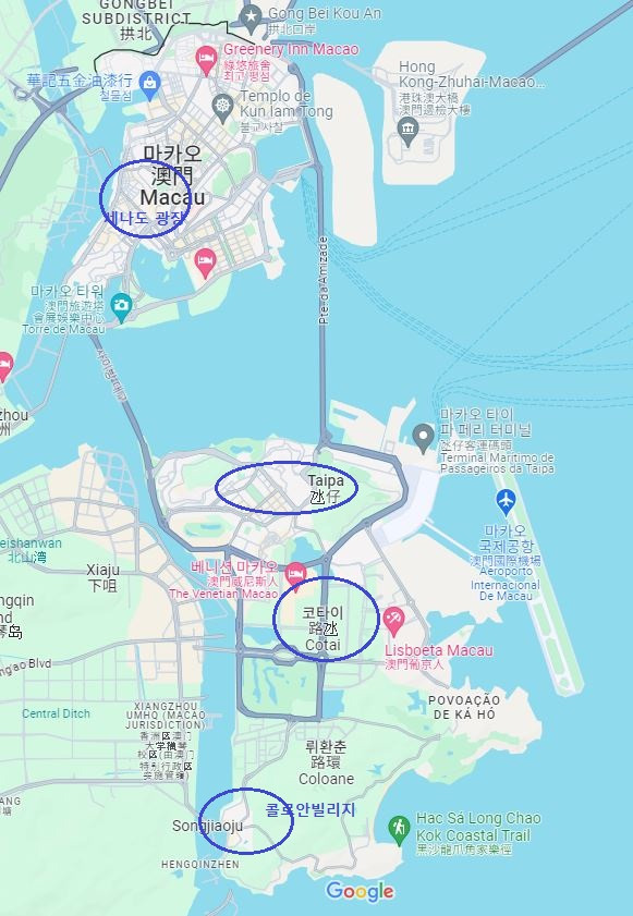 마카오 주요 관광지인 "마카오 반도(세나도 광장 등) / 타이파 빌리지 / 코타이 (호텔 밀집 지역) / 콜로안 빌리지" 의 경우 , 마카오 자체가 크지 않기 때문에 버스나 택시로 다녀도 대부분 20~30분이면 이동이 가능하기 때문에 조금 서두르면 하루에 모두 보는 것 가능. (추천 하지는 않음)