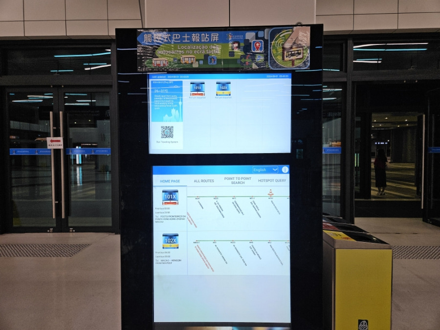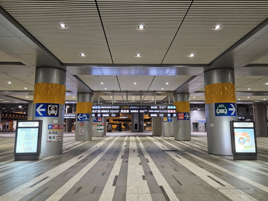 1층 나가는 곳 출구에 새벽에 마카오 시내로 이동할 수 있는 2개 버스노선 표시 중.