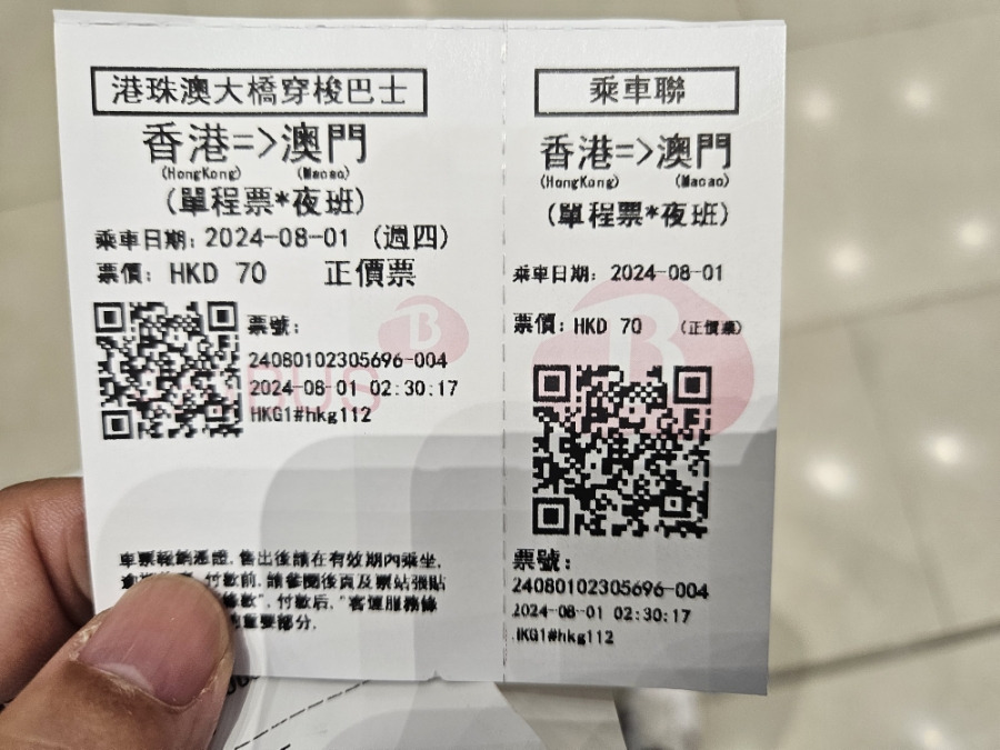꼭 마카오 가는 표 구입해야 하며 (주하이는 중국), 1인당 70홍달러로 버스표 구입.
